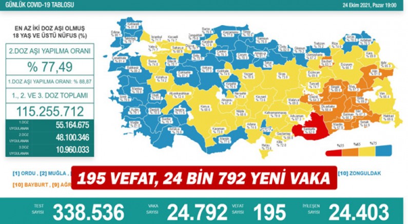 Sağlık Bakanlığı, 24 Ekim Corona virüs tablosunu paylaştı. Açıklanan tabloya göre son 24 saatte 338 bin 536 Kovid-19 testi yapıldı, 24 bin 792 kişinin testi pozitif çıktı, 195 kişi yaşamını yitirdi, iyileşenlerin sayısı ise 24 bin 403 oldu.