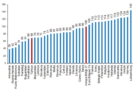 Kişi başına fiili bireysel tüketim düzeyi 27 Avrupa Birliği ülkesi ortalaması 100 iken, Türkiye için 68 oldu ve AB ortalamasının %32 altında kaldı. Karşılaştırmalarda yer alan 37 ülke arasında kişi başına fiili bireysel tüketim değeri en yüksek ülke 145 ile Lüksemburg, en düşük ülke ise 39 ile Arnavutluk oldu.