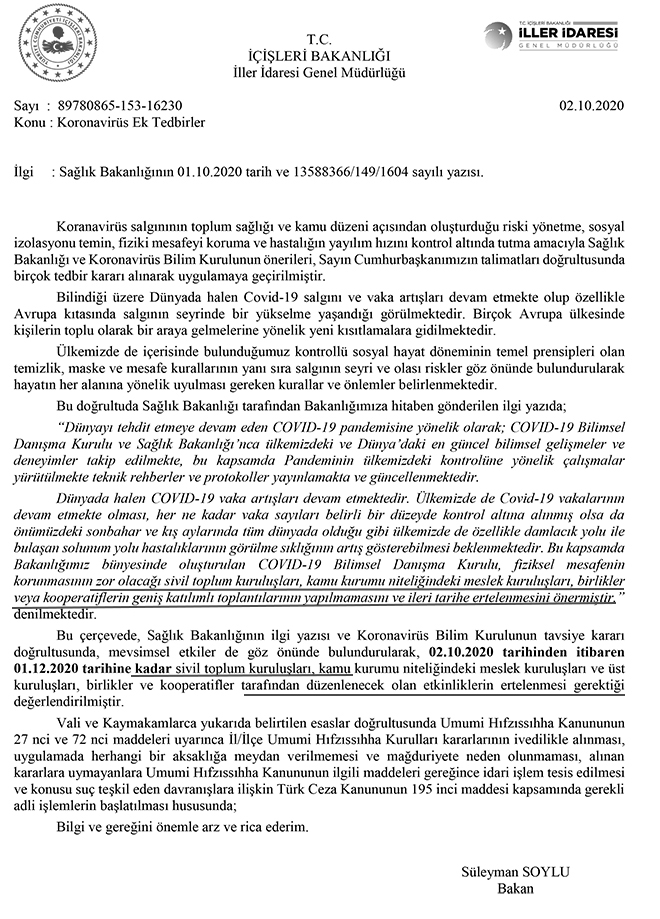 Dünyada halen COVID-19 vaka artışları devam etmektedir. Ülkemizde de Covid-19 vakalarının devam etmekte olması, her ne kadar vaka sayıları belirli bir düzeyde kontrol altına alınmış olsa da önümüzdeki sonbahar ve kış aylarında tüm dünyada olduğu gibi ülkemizde de özellikle damlacık yolu ile bulaşan solunum yolu hastalıklarının görülme sıklığının artış gösterebilmesi beklenmektedir. Bu kapsamda Bakanlığımız bünyesinde oluşturulan COVID-19 Bilimsel Danışma Kurulu, fiziksel mesafenin korunmasının zor olacağı sivil toplum kuruluşları, kamu kurumu niteliğindeki meslek kuruluşları, birlikler veya kooperatiflerin geniş katılımlı toplantılarının yapılmamasını ve ileri tarihe ertelenmesini önermiştir." ifadeleri yer aldı.