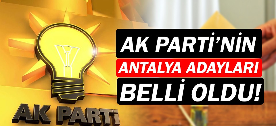 AK Parti, Antalya'da çıkaracağı adaylarını belirledi. Henüz resmi bir açıklama yapılmasa da listenin tamamlandığı ve o listedeki isimler kulislerde konuşulmaya başlandı.Antalya'daki belediye başkan adaylarının isimlerini ilan etmek için ise T.C Cumhurbaşkanı ve AK Parti Genel Başkanı Recep Tayyip Erdoğan'ın 27 Ocak Pazar Günü Antalya'ya gelmesi bekleniyor.