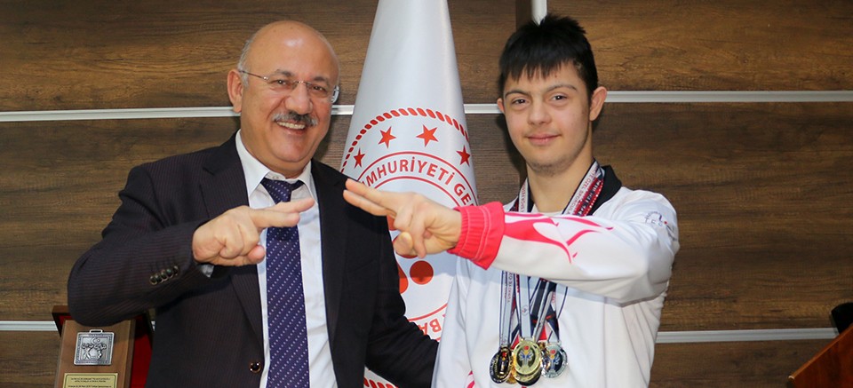 Antalya'da 3 yıl önce katılmaya başladığı yüzme yarışlarında 26 Türkiye şampiyonluğu kazanmasıyla milli takıma seçilmenin gururunu yaşayan down sendromlu 16 yaşındaki Alperen Menç Antalya Gençlik Spor İl Müdürü Doç Dr. Burhanettin Hacıcaferoğlu’nu makamında ziyaret etti.