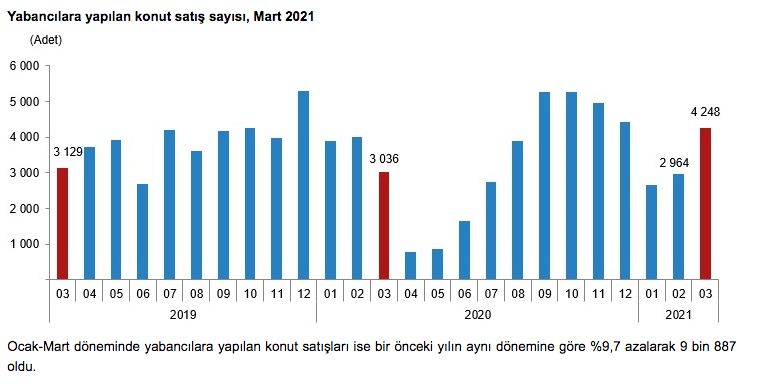 Yabancılara yapılan konut satışları bir önceki yılın aynı ayına göre %39,9 artarak 4 bin 248 oldu. Yabancılara yapılan konut satışlarında, Mart ayında ilk sırayı 2 bin 119 konut satışı ile İstanbul aldı. İstanbul'u sırasıyla 889 konut satışı ile Antalya, 252 konut satışı ile Ankara, 184 konut satışı ile Mersin ve 129 konut satışı ile Yalova izledi.