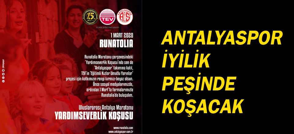 1 Mart Pazar günü Antalya’da gerçekleştirilecek olan Runatolia Maratonu’nda Yardımseverlik Koşusu’na katılacak olan Antalyaspor, ‘İyilik Peşinde Koş’ sloganı çerçevesinde oluşturulan ‘Antalyaspor Koşu Takımı’ ile eğitime de katkı koyacak. Türk Eğitim Vakfı Antalya Şubesi’nin ‘Eğitimli Kızlar Umutlu Yarınlar’ projesine destek olacak Antalyaspor koşu takımına yöneticiler, teknik ekip, futbolcular, kulüp personeli ve taraftarlar da dahil olabilecek.