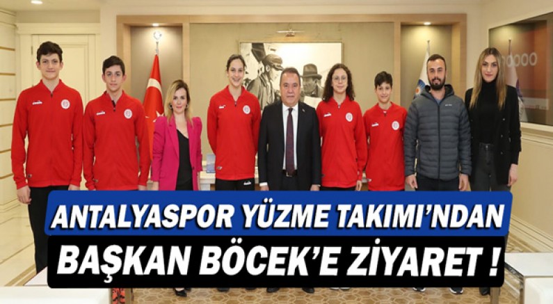 10 -13 Şubat tarihleri arasında Gebze Olimpik Yüzme Havuzunda gerçekleşen Türkiye Bireysel Açık Su Yüzme Kış Şampiyonası’na katılan ve kazandığı madalyalarla yarışlara damga vuran Antalyaspor Yüzme Takımı, Büyükşehir Belediye Başkanı Muhittin Böcek’i ziyaret etti. Ziyarete Antalyaspor Yüzme Takımı Baş Antrenörü Turgay Demircioğlu, Antrenör Tuğba Kızıl, Antalyaspor Kulübü Derneği Yönetim Kurulu Üyesi Selin Antalya, başarılı sporcular Türkiye rekortmeni milli yüzücü Emir Batur Albayrak, Türkiye rekortmeni Emre Sarp Zeytinoğlu, Türkiye rekortmeni milli yüzücü Sevim Eylül Süpürgeci, Türkiye şampiyonu milli yüzücü Talha Erdoğan ve Türkiye şampiyonu Boran Atasoy katıldı.