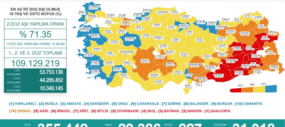En az iki doz aşı uygulananların oranının en yüksek olduğu 10 il; Kırklareli, Muğla, Amasya, Eskişehir, Ordu, Çanakkale, Edirne, Balıkesir, Burdur ve Osmaniye oldu.