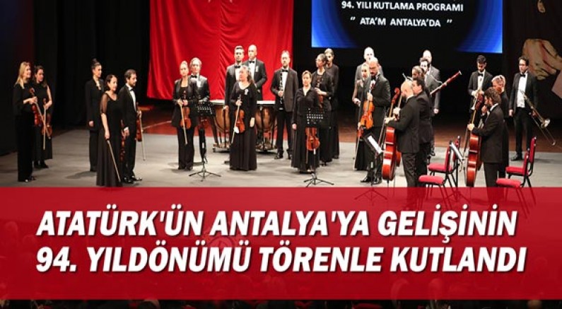 Antalya'yı 94 yıl önce ziyaret ederek, vatandaşların sevgi gösterileriyle karşılanan Gazi Mustafa Kemal Atatürk’ün, kenti ziyaretinin yıldönümü törenle kutlandı. Atatürk Kültür Merkezi'nde (AKM) düzenlenen törene Antalya Valisi Hulusi Şahin, Büyükşehir Belediye Başkanı Muhittin Böcek, protokol üyeleri, öğretmenler, öğrenciler ve vatandaşlar katıldı.