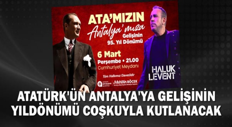 Atatürk'ün 6 Mart 1930 tarihinde Antalya ziyaretinin 95. yılı anlamlı etkinliklerle kutlanacak. Antalya Büyükşehir Belediyesi, etkinlikler kapsamında 6 Mart Perşembe günü ünlü sanatçı Haluk Levent’i halkla buluşturacak. Ünlü sanatçı Haluk Levent, 6 Mart Perşembe günü saat 21.00’de Cumhuriyet Meydanı'nda Antalyalılara muhteşem bir konser verecek. Haluk Levent, birinden coşkulu şarkılarını Antalyalılar ile birlikte seslendirecek. Büyükşehir Belediye Başkanı Muhittin Böcek, Antalyalıları Haluk Levent konserine ve Atatürk’ün Antalya’ya gelişinin 95’inci yılını coşkuyla kutlamaya davet etti.