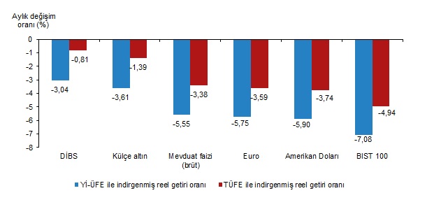 Yİ-ÜFE ile indirgendiğinde; yatırım araçlarından külçe altın %3,61, mevduat faizi (brüt) %5,55, Euro %5,75, Amerikan doları %5,90 ve BIST 100 endeksi %7,08 oranlarında yatırımcısına kaybettirdi. TÜFE ile indirgendiğinde yatırım araçlarından külçe altın %1,39, mevduat faizi (brüt) %3,38, Euro %3,59, Amerikan doları %3,74 ve BIST 100 endeksi %4,94 oranlarında yatırımcısına kaybettirdi.