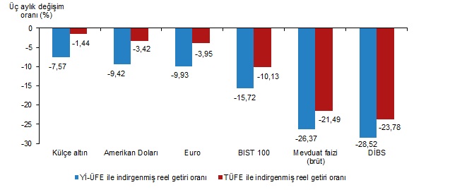 Külçe altın, üç aylık değerlendirmede; Yİ-ÜFE ile indirgendiğinde %7,57, TÜFE ile indirgendiğinde ise %1,44 oranında yatırımcısına en az kaybettiren yatırım aracı olurken; DİBS, Yİ-ÜFE ile indirgendiğinde %28,52, TÜFE ile indirgendiğinde ise %23,78 oranında yatırımcısına en çok kaybettiren yatırım aracı oldu.