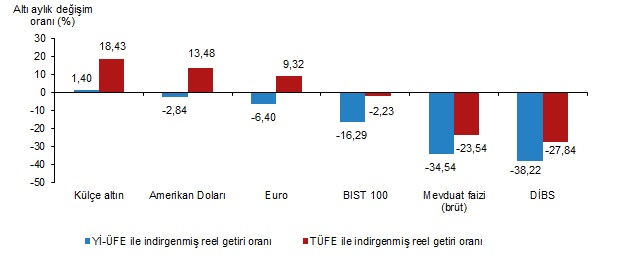 Altı aylık değerlendirmeye göre külçe altın; Yİ-ÜFE ile indirgendiğinde %1,40, TÜFE ile indirgendiğinde ise %18,43 oranında yatırımcısına en yüksek reel getiri sağlayan yatırım aracı oldu. Aynı dönemde DİBS, Yİ-ÜFE ile indirgendiğinde %38,22, TÜFE ile indirgendiğinde ise %27,84 oranında yatırımcısına en çok kaybettiren yatırım aracı oldu.