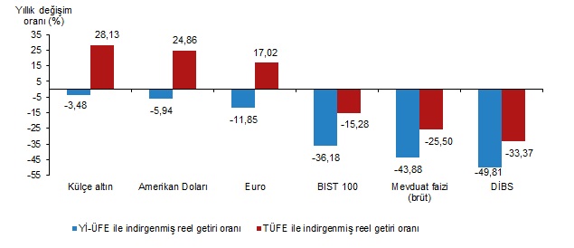 Yıllık değerlendirmede, Yİ-ÜFE ile indirgendiğinde; yatırım araçlarından Amerikan Doları %5,94, Euro %11,85, BIST 100 endeksi %36,18, mevduat faizi (brüt) %43,88 ve DİBS %49,81 oranlarında yatırımcısına kaybettirmiştir. TÜFE ile indirgendiğinde ise Amerikan Doları %24,86 ve Euro %17,02 oranlarında yatırımcısına kazandırırken; BIST 100 endeksi %15,28, mevduat faizi (brüt) %25,50 ve DİBS %33,37 oranlarında yatırımcısına kaybettirmiştir.