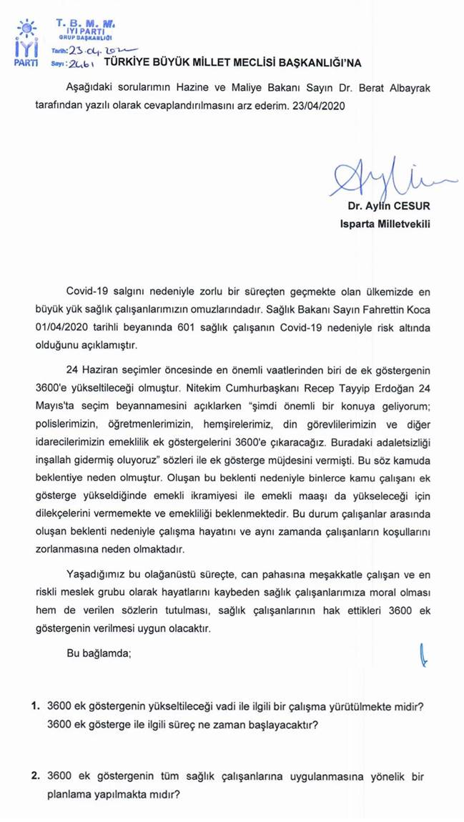 Meclis kürsüsünden de daha evvel defalarca 3600 ek göstergenin söz verilen meslek gruplarına verilmesi için konuşmalar yapan, önergeler veren İYİ Parti Isparta Milletvekili Dr. Aylin Cesur’un Hazine Bakanı Sayın Berat Albayrak’ın cevaplaması için verdiği önerge: