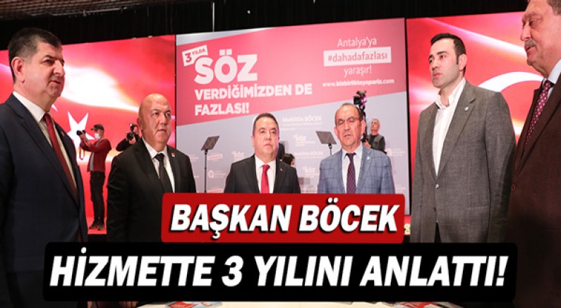 3 yıllık süreçte yapılan çalışmaları anlatan Başkan Böcek, “5 yıllık görev süremiz tamamlanmadan, sadece sözünü verdiğimiz 77 projeyi değil; en az 142 önemli projeyi bitirmiş olacağız” dedi.