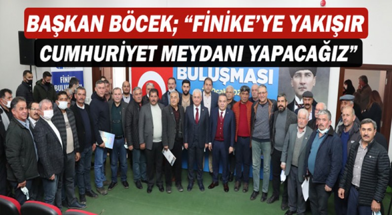 Başkan Muhittin Böcek, Finike’ye önemli yatırımlar yaptıklarını belirterek, “Finike Belediyemizin 60 milyon TL’lik bütçesi kadar Büyükşehir Belediyesi olarak Finike’ye yatırım yapıyoruz. Finike’mize yakışır bir Cumhuriyet Meydanı yapacağız. Muhtarlarımızın, STK temsilcilerimizin talep ve önerilerini alarak, birlikte çözüm önerileri getiriyoruz. Ben sizlere yapamayacağım hiçbir söz vermem. Seçim döneminde Finike meydanına gelip miting yaptığımız günlerde ne söylediysek onları yapmaya çalışıyoruz. Hayatım boyunca vatandaşlarımızın hep dertlerine derman olmaya çalıştım. Ne söylediysek onu da sırasıyla yapıyoruz” dedi.