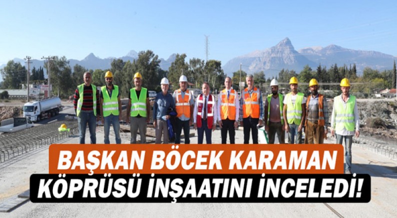Köprü inşaatı ile ilgili bilgi veren Başkan Muhittin Böcek, “6 kolon ve 14 kirişten oluşan köprünün son aksı yerleştirildi. Betonarme imalatı tamamlanmasıyla, sıcak asfalt dökülerek, kaldırımları yapılacak. Karaman Köprüsü’nün tamamlanmasından sonra ise köprünün doğusuna doğru Uncalı Kavşağı’na giden yolun bir kısmını genişleteceğiz ve kaldırım yapacağız” ifadelerini kullandı.