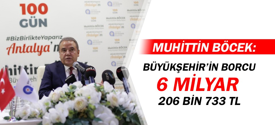 Büyükşehir Belediye Başkanı Muhittin Böcek görevde bulunduğu 100 günlük süreci basın toplantısı ile değerlendirdi. Antalya Büyükşehir Belediyesi’nin borçlarıyla ilgili de açıklamalarda bulunan Başkan Muhittin Böcek, “31 Mart 2019 tarihi itibari ile belediyemizin 4 milyar 312 milyon 11 bin TL, ASAT’ın 1 milyar 698 bin 455 TL, iştiraklerimizin ise 196 milyon 266 bin TL olmak üzere toplam 6 milyar 206 bin 733 TL. borcu bulunmaktadır. 3 milyar 400 milyon borcu olduğunu düşündüğüm Büyükşehir Belediyemizin 6 milyar 206 bin borcu olduğunu göreve geldiğimiz gün itibariyle gördük, anladık. Ama şunu altını çizerek özellikle söylemek istiyorum 20 yıllık belediye başkanlığım döneminde olduğu gibi Büyükşehir Belediye Başkanı olarak da borç edebiyatı ile vatandaşa hizmetimden asla geri kalmayacağım” dedi.