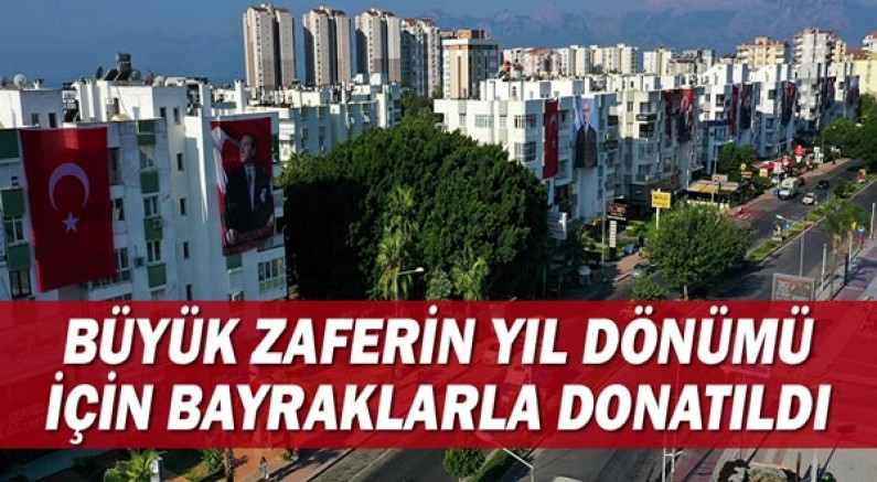 Muratpaşa Belediyesi, her milli bayramda olduğu gibi 30 Ağustos Zafer Bayramı için belediyenin ana hizmet binasının da bulunduğu Tekelioğlu Caddesi’ni dev Türk bayrakları ve Atatürk posterleriyle süsledi. Caddeye bakan apartmanlara asılan bayraklarla Antalyalılar, 30 Ağustos heyecanını bir gün öncesinden yaşamaya başladı.
