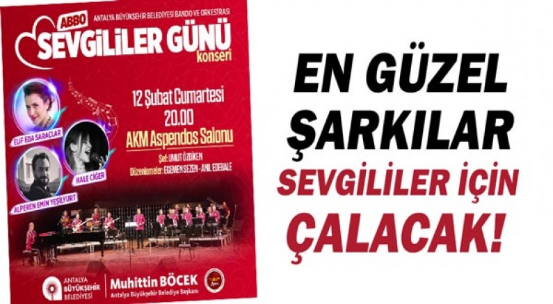 Atatürk Kültür Merkezi Aspendos Salonu’nda ücretsiz olarak düzenlenecek konserde Elif Eda Saraçlar, Hale Ciğer ve Alperen Emin Yeşilyurt sahne alacak. Genç şarkıcılar, Antalya Büyükşehir Belediyesi Bando ve Orkestrası’nın çalacağı en güzel aşk şarkılarını seslendirecek. Düzenlemelerini Egemen Sezen ve Anıl Edebale’nin yaptığı şarkılar sevgililer için söylenecek.