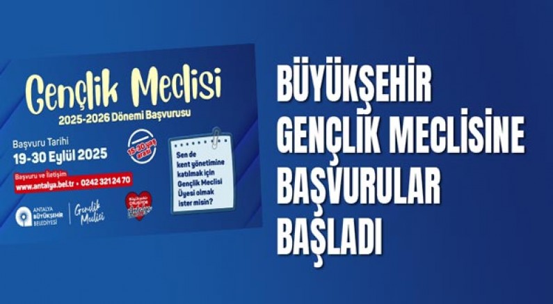 Gençlerin fikir ve önerileriyle kent yönetiminde söz sahibi olmasını sağlayan, fikirlerini özgürce dile getirebilecekleri Antalya Büyükşehir Belediyesi Gençlik Meclisi 2025- 2026 dönemi yeni dönem başvuruları başladı. Antalya Büyükşehir Belediyesi Gençlik Meclisi’ne başvurular 30 Eylül’e kadar devam edecek.