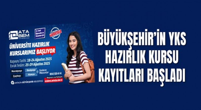 Üniversiteye hazırlanan 12’nci sınıf öğrencilerine ve lise mezunlarına yönelik ATABEM Muratpaşa, Çaybaşı, Gazipaşa ve Alanya (Alanya ve Gazipaşa’da sadece mezunlar) ücretsiz akademik kurslar açılacak. YKS sınavına hazırlık kurslarının kayıtları 18 - 24 Ağustos tarihleri arasında online yapılacak. Kurs için atabem.antalya.bel.tr adresinden kayıt yapılabilecek. YKS kurs kayıtları hakkında bilgi almak isteyen öğrenciler 0242 325 41 41 nolu telefondan gerekli bilgilere ulaşabilecekler.
