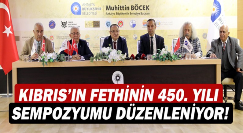 Kıbrıs’ın fethinin 450. yıldönümü etkinlikleri kapsamında, 22-24 Kasım tarihleri arasında Akdeniz Üniversitesi Edebiyat Fakültesi Bumin Kaan Konferans Salonu’nda düzenlenecek sempozyum nedeniyle Antalya Büyükşehir Belediyesi’nde basın toplantısı düzenlendi. Toplantıya Antalya Büyükşehir Belediyesi Genel Sekreter Yardımcısı Mustafa Gürbüz, Antalya Türk Ocağı Başkanı Abdullah Uysal, Kıbrıs Türk Kültür Derneği Antalya Şube Başkanı Vural Önal, Akdeniz Üniversitesi Edebiyat Fakültesi Dekan Yardımcısı Doç. Dr. Güven Dinç, Akdeniz Gençlik Sanat ve Eğitim Derneği Proje Koordinatörü Orm. Yük. Müh. Özer Satılmış Özgüç ve Türk Hava Kurumu Antalya Şube Başkanı Süleyman Girgin katıldı.