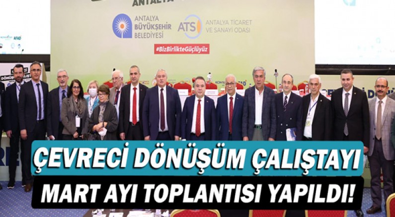 Antalya'nın çevreci dönüşüm hedeflerinin belirlenmesine öncülük etmek amacıyla Antalya Büyükşehir Belediyesi ve Antalya Ticaret ve Sanayi Odası’nın koordinasyonunda düzenlenen Çevreci Dönüşüm Çalıştayı’nın Mart ayı toplantısı yapıldı. Toplantıya Antalya Valisi Ersin Yazıcı, Antalya Büyükşehir Belediye Başkanı Muhittin Böcek, Antalya Ticaret ve Sanayi Odası Başkanı Davut Çetin ve ATSO yönetimi, ilçe belediyelerinden başkan yardımcıları, meslek örgütü temsilcileri, sivil toplum kuruluşu başkanları ve üniversitelerden akademisyenler katıldı.