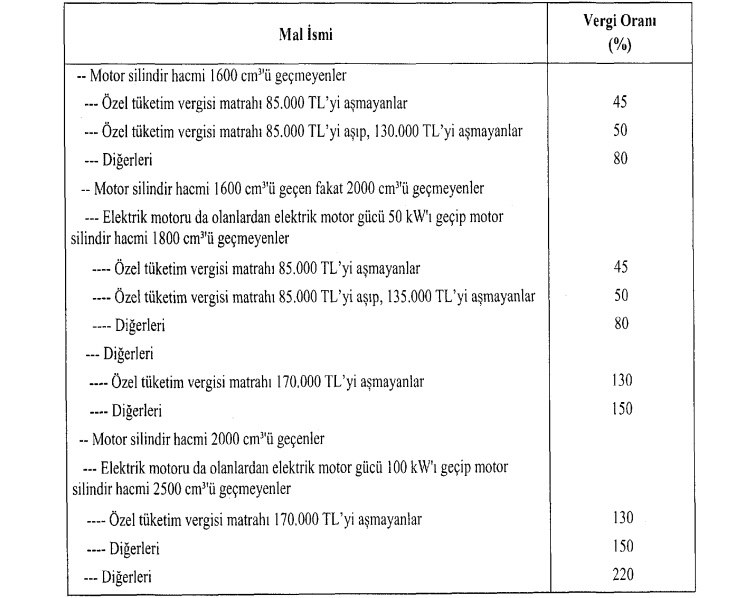 Kararda, 4760 sayılı Özel Tüketim Vergisi Kanununa ekli (II) sayılı listedeki 87.03 G.T.İ.P. numaralı mallardan “Diğerleri” satırı altında yer alan bazılarının ÖTV oranlarına esas özem tüketim vergisi matrahları ile özel tüketim vergisi oranları yeniden tespit edildi, karar hükümlerini, Hazine ve Maliye Bakanı yürütecek.