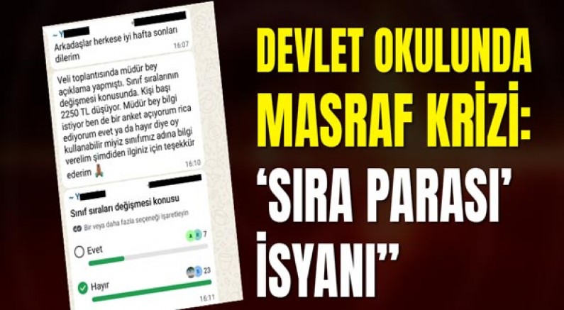 Velilerin şikayetleri üzerine okul yönetimi, masaların ve sıraların yenilenmesinin velilerin talebi doğrultusunda yapılabileceğini bildirdi. Bunun üzerine sınıf sorumlusu tarafından kurulan mesajlaşma grubunda, kişi başı 2 bin 250 TL ücret karşılığında yeni sıra ve masa alınabileceği duyuruldu.