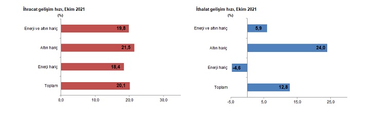 Özel ticaret sistemine göre, 2021 yılı Ekim ayında, ihracat bir önceki yılın aynı ayına göre %20,7 artarak 19 milyar 831 milyon dolar, ithalat %15,3 artarak 21 milyar 599 milyon dolar olarak gerçekleşti.
