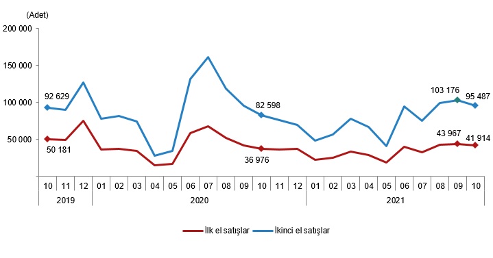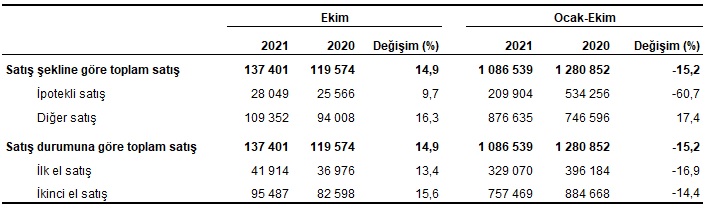 Türkiye genelinde ikinci el konut satışları Ekim ayında bir önceki yılın aynı ayına göre %15,6 artış göstererek 95 bin 487 oldu. Toplam konut satışları içinde ikinci el konut satışının payı %69,5 oldu. İkinci el konut satışları Ocak-Ekim döneminde ise bir önceki yılın aynı dönemine göre %14,4 azalışla 757 bin 469 olarak gerçekleşti.