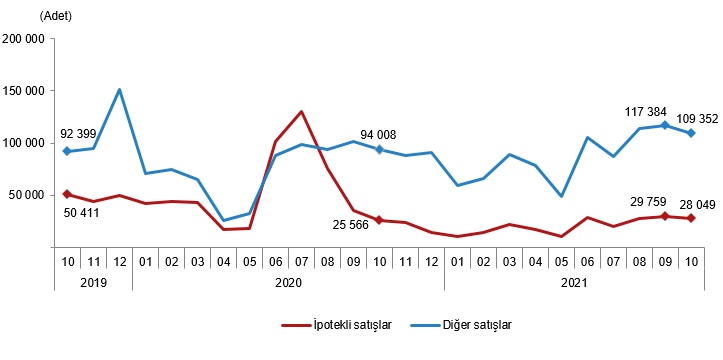 Türkiye genelinde ipotekli konut satışları Ekim ayında bir önceki yılın aynı ayına göre %9,7 artış göstererek 28 bin 49 oldu. Toplam konut satışları içinde ipotekli satışların payı %20,4 olarak gerçekleşti. Ocak-Ekim döneminde gerçekleşen ipotekli konut satışları ise bir önceki yılın aynı dönemine göre %60,7 azalışla 209 bin 904 oldu.