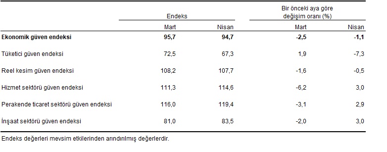 Bir önceki aya göre Nisan ayında tüketici güven endeksi %7,3 oranında azalarak 67,3 değerini, reel kesim güven endeksi %0,5 oranında azalarak 107,7 değerini aldı. Hizmet sektörü güven endeksi %3,0 oranında artarak 114,6 değerini, perakende ticaret sektörü güven endeksi %2,9 oranında artarak 119,4 değerini, inşaat sektörü güven endeksi %3,0 oranında artarak 83,5 değerini aldı.