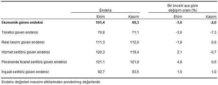 Tüketici güven endeksi bir önceki aya göre Kasım ayında %7,3 oranında azalarak 71,1 değerini, hizmet sektörü güven endeksi %0,7 oranında azalarak 119,4 değerini aldı. Reel kesim (imalat sanayi) güven endeksi %0,6 oranında artarak 112,0 değerini, perakende ticaret sektörü güven endeksi %0,6 oranında artarak 121,9 değerini, inşaat sektörü güven endeksi %1,0 oranında artarak 93,6 değerini aldı.