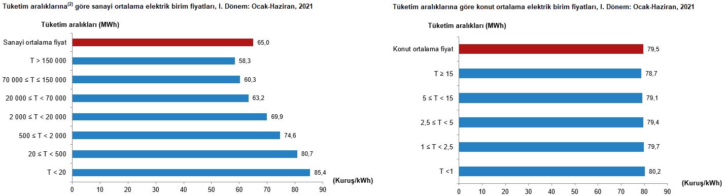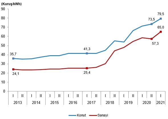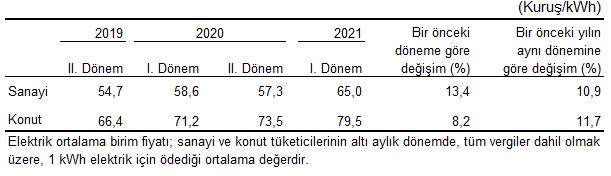 Konutlarda, 1 kWh elektrik için, tüketicilerin 2021 yılı I. döneminde ödediği tutar bir önceki döneme göre %8,2, bir önceki yılın aynı dönemine göre ise %11,7 artarak ortalama 79,5 kuruş oldu.
