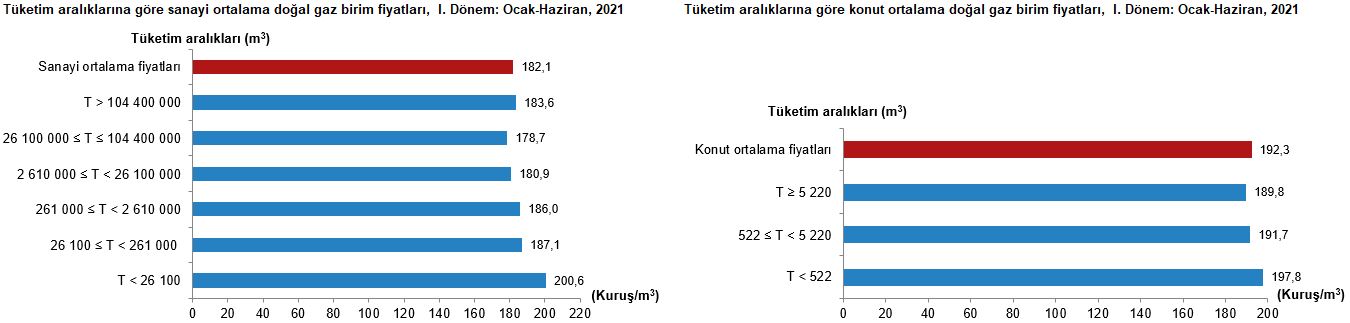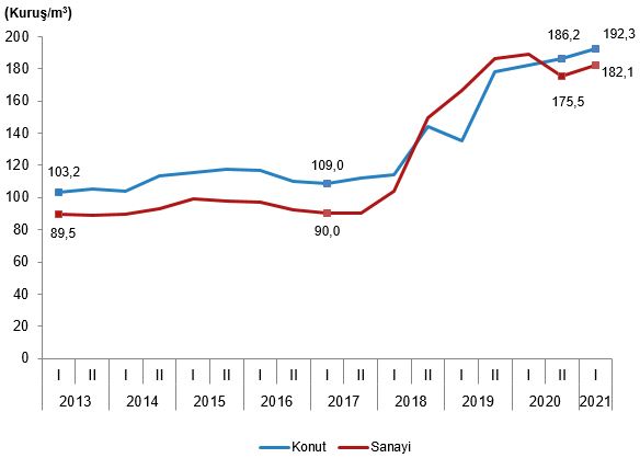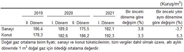 Konutlarda, 1 m3 doğal gaz için tüketicilerin 2021 yılı I. döneminde ödediği tutar bir önceki döneme göre %3,3, bir önceki yılın aynı dönemine göre ise %5,3 artarak ortalama 192,3 kuruş oldu.