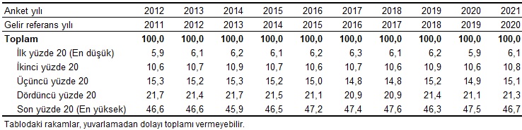 Sıralı yüzde 20'lik gruplar itibarıyla yıllık eşdeğer hanehalkı kullanılabilir fert gelirinin dağılımı (%), 2012-2021