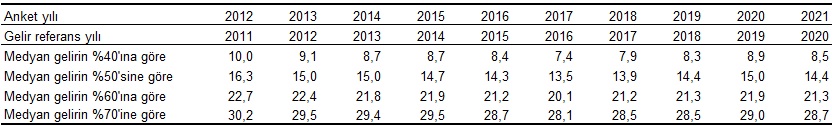 Toplumun genel düzeyine göre belirli bir sınırın altında gelire sahip olan bireyler göreli anlamda yoksul sayılmaktadır. Eşdeğer hanehalkı kullanılabilir fert medyan gelirinin %50'si dikkate alınarak belirlenen yoksulluk sınırına göre, yoksulluk oranı 2021 yılında 0,6 puan azalarak %14,4 oldu. Medyan gelirin %60'ı dikkate alınarak belirlenen yoksulluk sınırına göre yoksulluk oranı ise son yılda 0,6 puan azalarak %21,3 olarak gerçekleşti.