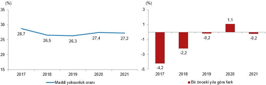 Yukarıda belirtilen dokuz maddenin en az dördünü karşılayamayanların oranı olarak tanımlanan ciddi maddi yoksunluk oranı; 2020 yılında %27,4 iken 2021 yılı anket sonuçlarında 0,2 puan azalarak %27,2 olarak gerçekleşti.