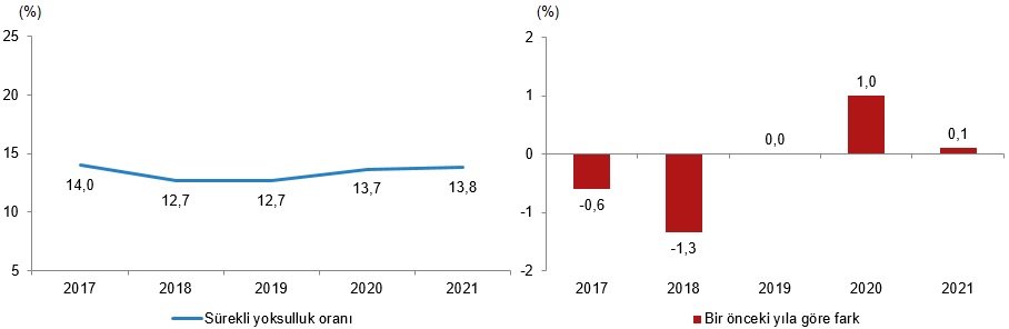 Dört yıllık panel veri kullanılarak hesaplanan sürekli yoksulluk oranı, eşdeğer hanehalkı kullanılabilir fert medyan gelirinin %60'ına göre son yılda ve aynı zamanda önceki üç yıldan en az ikisinde de yoksul olan fertleri kapsamaktadır. Buna göre, 2021 yılı anket sonuçlarına göre sürekli yoksulluk oranı bir önceki yıla göre 0,1 puan artarak %13,8 oldu.