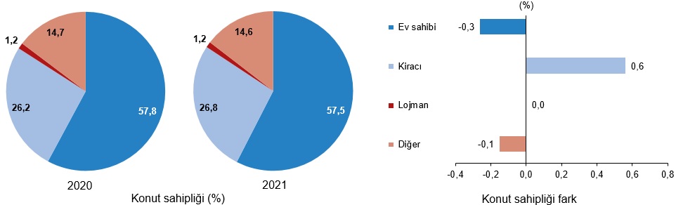 Oturulan konuta sahip olanların oranı geçen yıla göre 0,3 puan azalarak 2021 yılında %57,5 olarak hesaplanırken, kirada oturanların oranı %26,8, lojmanda oturanların oranı %1,2, kendi konutunda oturmayıp kira ödemeyenlerin oranı ise %14,6 oldu.