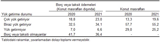 Geçen yıla göre konut alımı ve konut masrafları dışında borç veya taksit ödemesi olanların oranı 5,4 puan artarak %63,7 oldu. Nüfusun %6,6'sına bu ödemeler yük getirmezken %23,0'ına çok yük getirdi. Hanelerin %60,8'i evden uzakta bir haftalık tatil masraflarını, %38,3'ü iki günde bir et, tavuk ya da balık içeren yemek masrafını, %33,4'ü beklenmedik harcamaları, %20,5'i evin ısınma ihtiyacını, %62,9'u eskimiş mobilyaların yenilenmesini ekonomik olarak karşılayamadığını beyan etti.