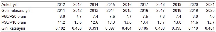 Gelir dağılımı eşitsizliği ölçütlerinden olan Gini katsayısı, sıfıra yaklaştıkça gelir dağılımında eşitliği, bire yaklaştıkça gelir dağılımında bozulmayı ifade etmektedir. En son yapılan araştırma sonuçlarına göre Gini katsayısı bir önceki yıla göre 0,009 puan azalış ile 0,401 olarak tahmin edildi. Toplumun gelirden en fazla pay alan %20'sinin elde ettiği gelirin en az pay alan %20'sinin elde ettiği gelire oranı şeklinde hesaplanan P80/P20 oranı 8,0'dan 7,6'ya, gelirden en fazla pay alan %10'unun elde ettiği gelirin en az pay alan %10'unun elde ettiği gelire oranı şeklinde hesaplanan P90/P10 oranı ise 14,6'dan 13,7'ye düştü.