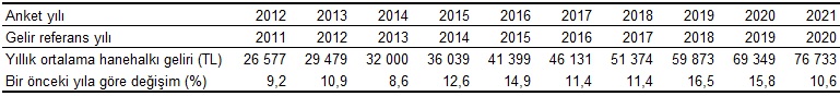 Türkiye'de yıllık ortalama hanehalkı kullanılabilir geliri %10,6 artarak 2021 yılı anket sonuçlarına göre 76 bin 733 TL oldu.