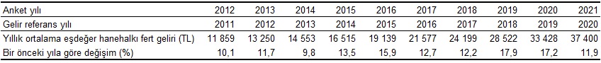 Türkiye'de yıllık ortalama eşdeğer hanehalkı kullanılabilir fert geliri bir önceki yıla göre %11,9 artarak 33 bin 428 TL'den 37 bin 400 TL'ye yükseldi.