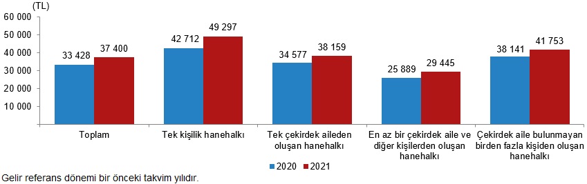 Yıllık ortalama eşdeğer hanehalkı kullanılabilir fert gelirlerinde en yüksek gelir, geçen yıla göre 6 bin 585 TL artarak 49 bin 297 TL ile tek kişilik hanehalklarının oldu. Çekirdek aile bulunmayan birden fazla kişiden oluşan hanehalklarının yıllık ortalama eşdeğer hanehalkı kullanılabilir fert geliri 41 bin 753 TL iken tek çekirdek aileden oluşan hanehalklarında bu değer 38 bin 159 oldu. En düşük yıllık ortalama eşdeğer kullanılabilir hanehalkı fert gelirine sahip hanehalkı tipi ise 29 bin 445 TL ile en az bir çekirdek aile ve diğer kişilerden oluşan hanehalkları oldu.