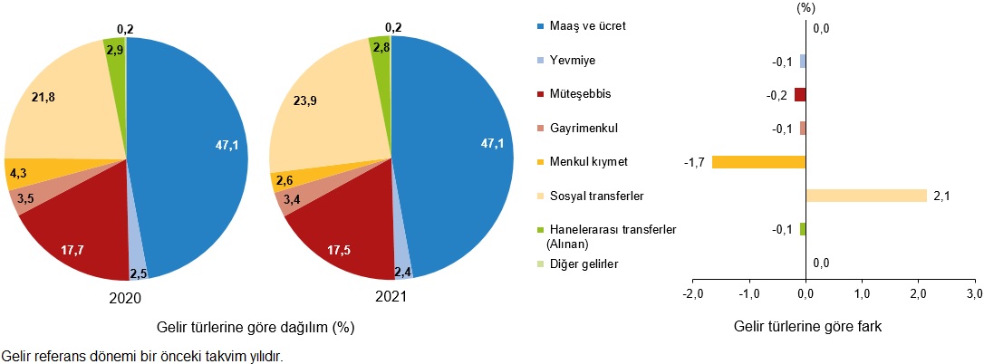 Toplam gelir içerisinde en yüksek payı, %47,1 ile bir önceki yıla göre aynı kalan maaş ve ücret geliri aldı. İkinci sırayı %23,9 ile önceki yıla göre 2,1 puanlık artış gösteren sosyal transfer geliri alırken üçüncü sırayı %17,5 ile önceki yıla göre 0,2 puan azalan müteşebbis geliri oluşturdu.