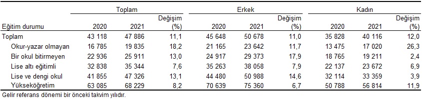 Yıllık ortalama esas iş gelirleri sırasıyla yükseköğretim mezunlarında 68 bin 229 TL, lise ve dengi okul mezunlarında 47 bin 326 TL, lise altı eğitimlilerde 35 bin 344 TL, bir okul bitirmeyenlerde 25 bin 911 TL ve okur-yazar olmayan fertlerde 19 bin 835 TL olarak hesaplandı. Geçen yıla göre yıllık ortalama esas iş gelirinde en yüksek artış %18,2 ile okur-yazar olmayan, en düşük artış ise %7,6 ile lise altı eğitimli fertlerde oldu.