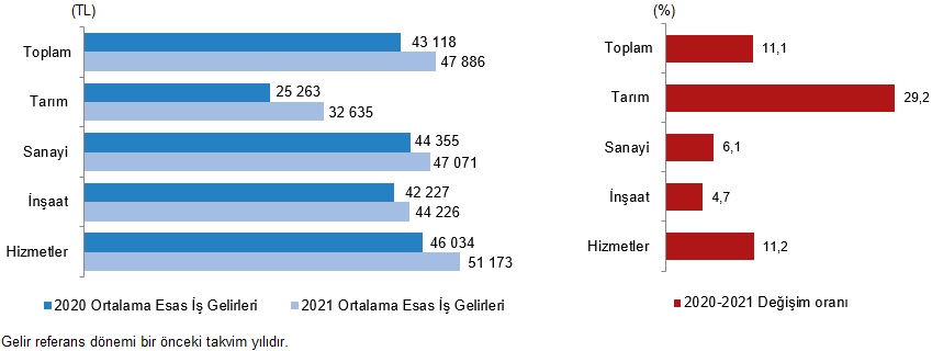 Esas iş gelirleri sektörel ayrımda incelendiğinde; en yüksek yıllık ortalama gelirin 51 bin 173 TL ile hizmet sektöründe, en düşük yıllık ortalama gelirin ise 32 bin 635 TL ile tarım sektöründe olduğu görüldü. Bir önceki yıla göre; yıllık ortalama esas iş gelirinde en yüksek artış %29,2 ile tarım sektöründe gözlenirken, bunu %11,2 ile hizmet sektörü izledi. Diğer taraftan sanayi sektöründe %6,1, inşaat sektöründe ise %4,7 artış gözlendi.