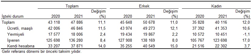 Esas işteki durumlarına göre yıllık ortalama esas iş gelirleri (TL), 2020, 2021