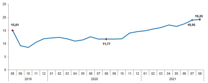 TÜFE’de (2003=100) 2021 yılı Ağustos ayında bir önceki aya göre yüzde 1,12, bir önceki yılın Aralık ayına göre yüzde 11,65, bir önceki yılın aynı ayına göre yüzde 19,25 ve on iki aylık ortalamalara göre yüzde 15,78 artış gerçekleşti.